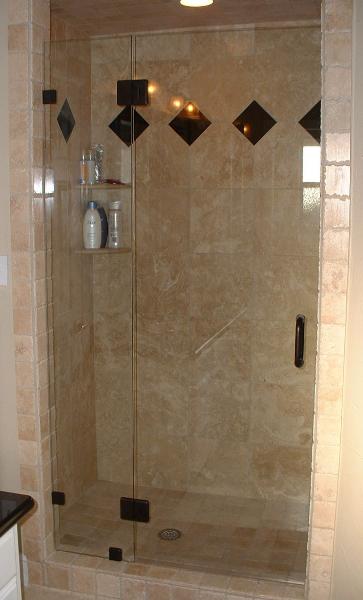 | This is an example of a 3/8" frameless shower enclosure with oil rubbed bronze glass to glass hinges, U-clamps, and a 6" loop handle. The walls in this shower were not plumb and the curb was not level, so great care had to be taken when ordering the glass (out of square) so that the fit and finish would be up to our standards. |