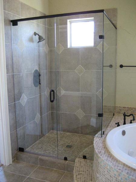 | This is an example of a 3/8" frameless shower enclosure with oil rubbed bronze pivot hinges, a header, U-clamps, and a 6" loop handle. |