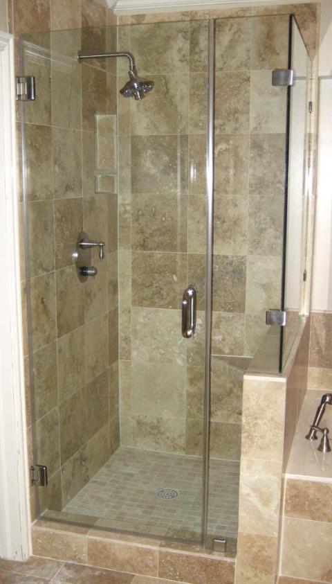 | 3/8" clear heavy glass frameless shower enclosure with brush nickel hinges, U-clamps, 90 degree corner clamps and a 6" loop handle. Also visible, because of the camera flash, are the clear acrylic seal and the strike piece. |