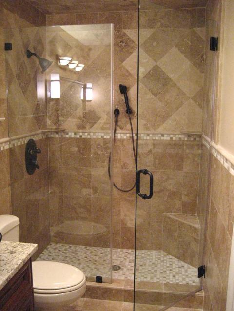 | 3/8" clear heavy glass frameless shower enclosure with oil rubbed bronze hinges, U-clamps and a 6" loop handle. Both the door and the fixed side panel had a half circle notch cut out for the chair rail. |