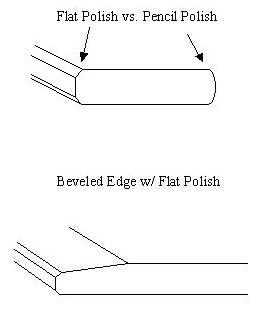 | Glass Shelves, Table Top & Desktop, Patio Table, Etc. $50.00 Minimum Order. But, there will be little to no charge for delivery! (depending on size, weight, value, and distance): Glass tops are typically 1/4" clear, bronze or gray with flat polished or beveled edges. Shelves are typically 1/4", 3/8", or 1/2" thick with flat polished edges. Circles can also be ordered with either a flat polished or pencil polished edge (rounded). All require about four to five business days. Radius corners or cutouts (holes) may require a couple of extra days. A profile of the edge work available can be seen below. |