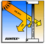 The chart here shows a window with SunTex installed. In midsummer as much as 230 BTUs can fall on each unprotected square foot of glass. With SunTex installed, up to 80% or even 90%* of the sun's heat and glare is reflected, absorbed and dissipated before it strikes the window. |